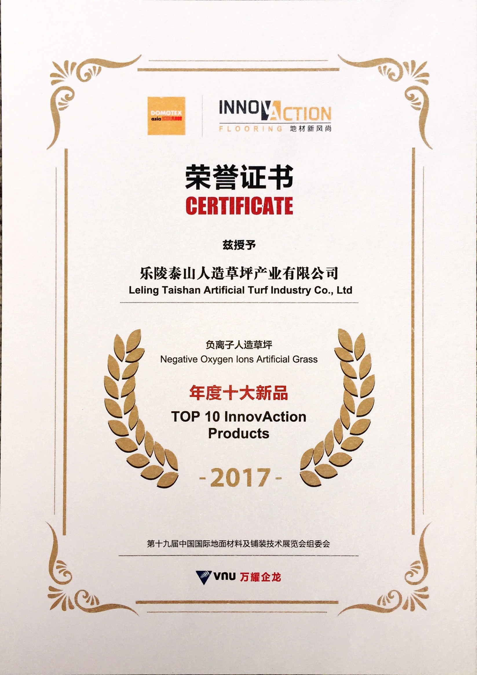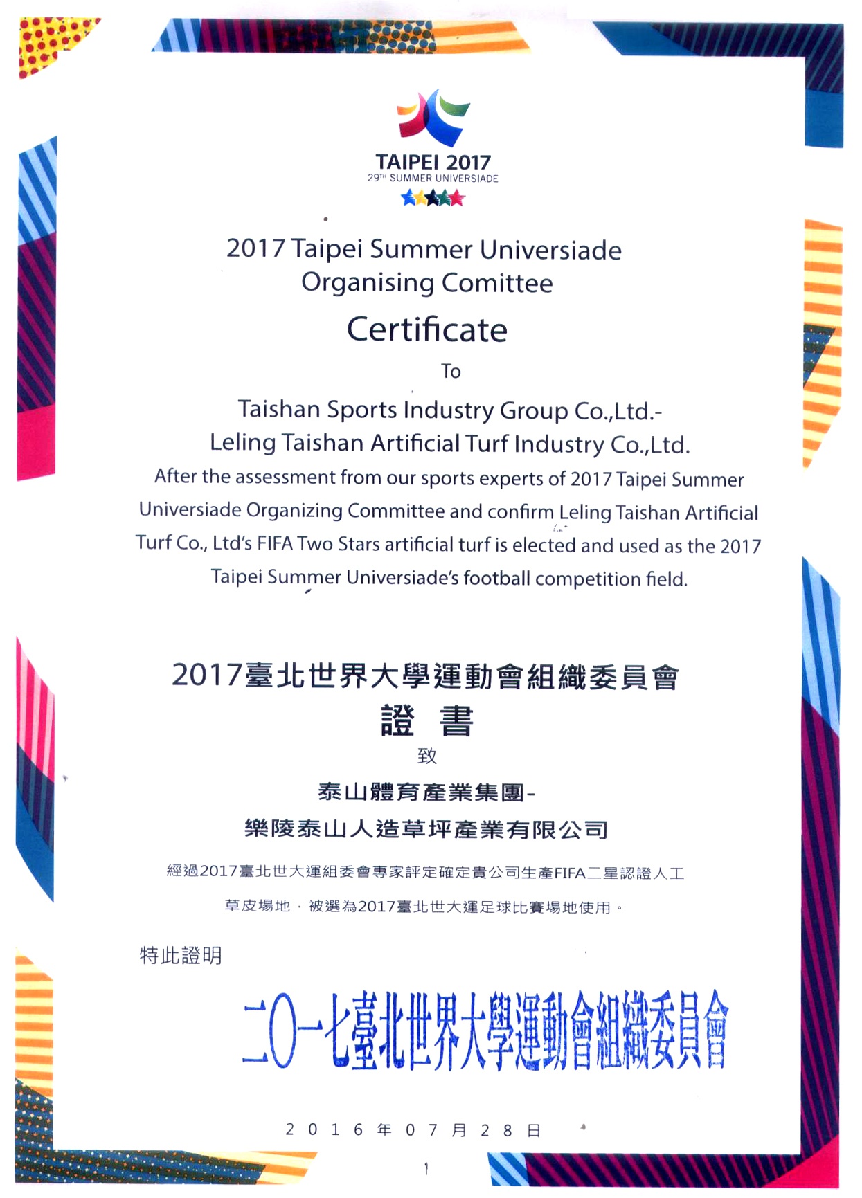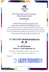2017台北世界大学运动会组织委员会证书致乐陵XC体育人造草坪产业有限公司